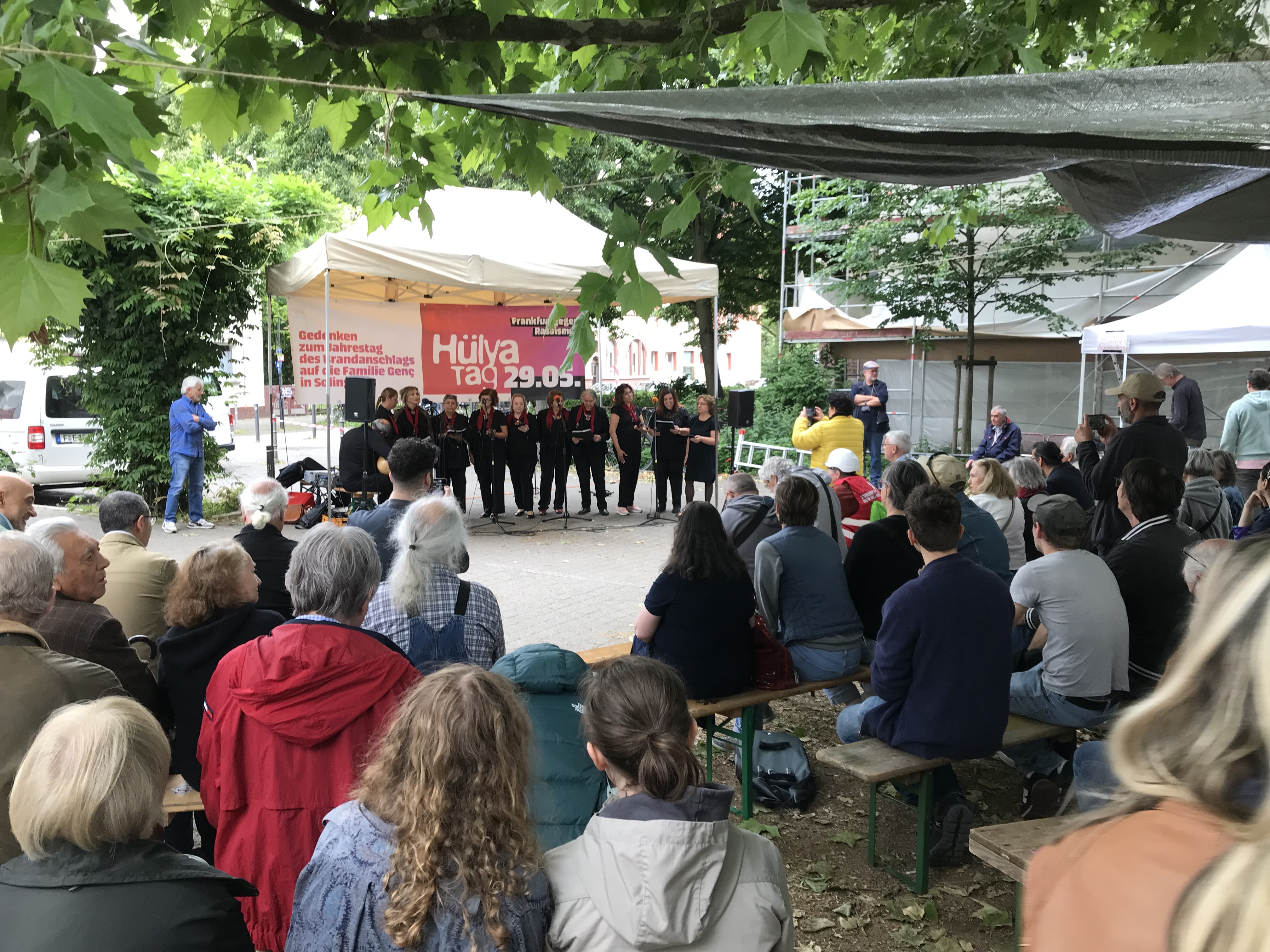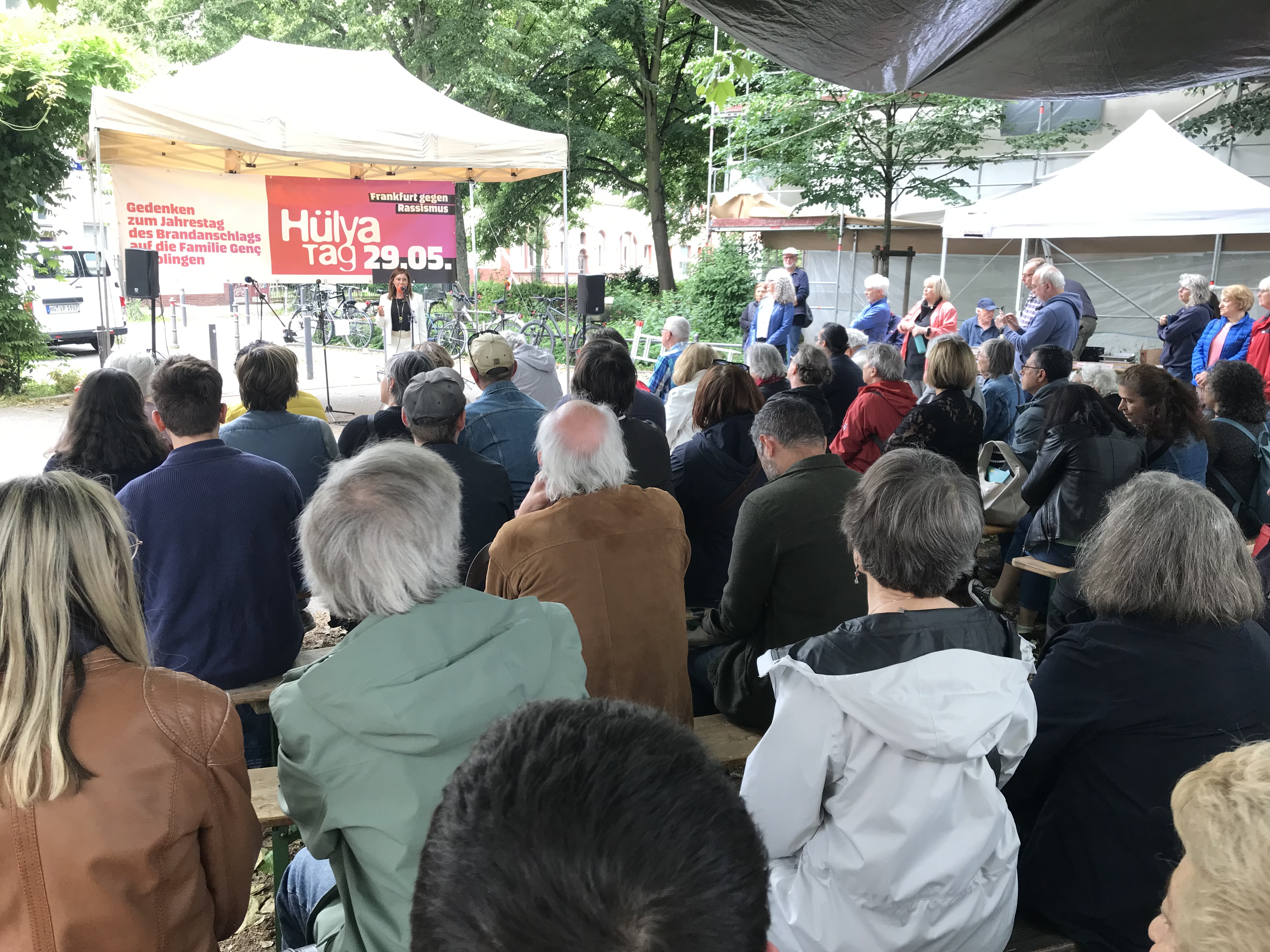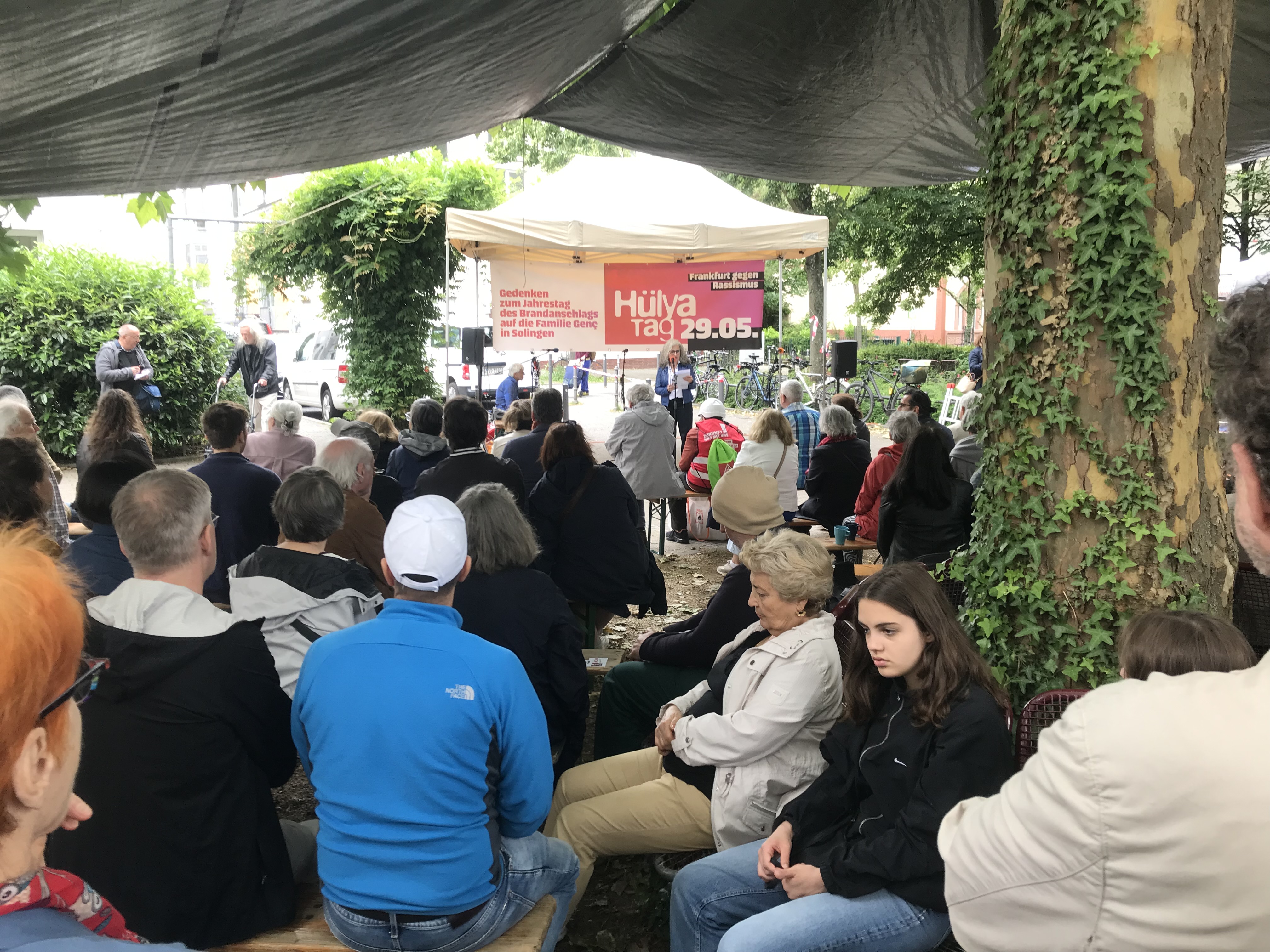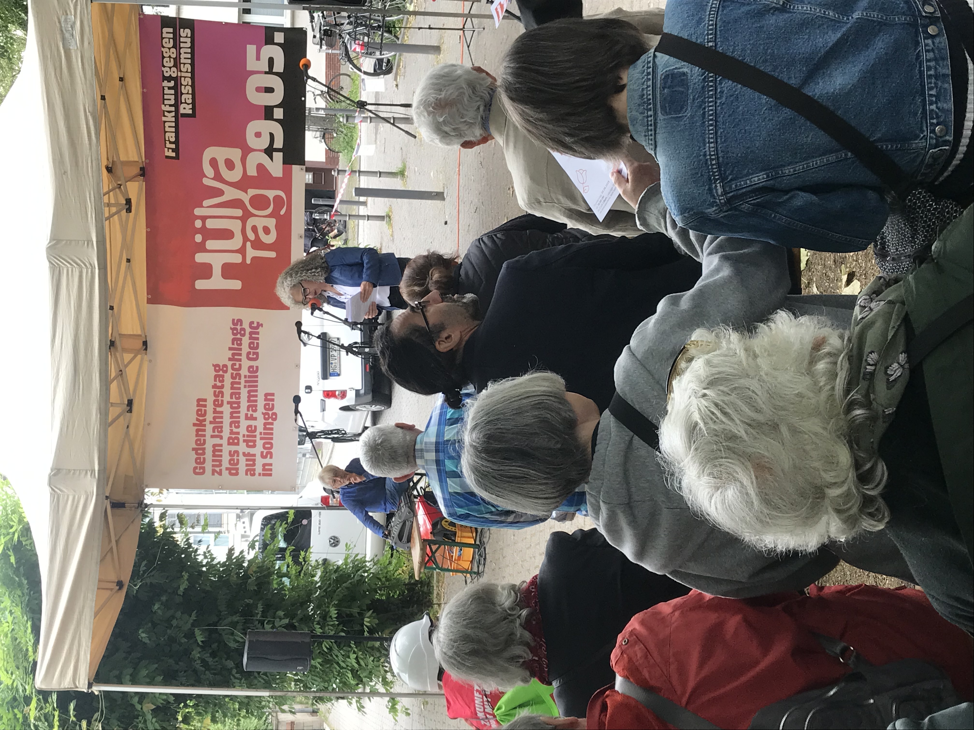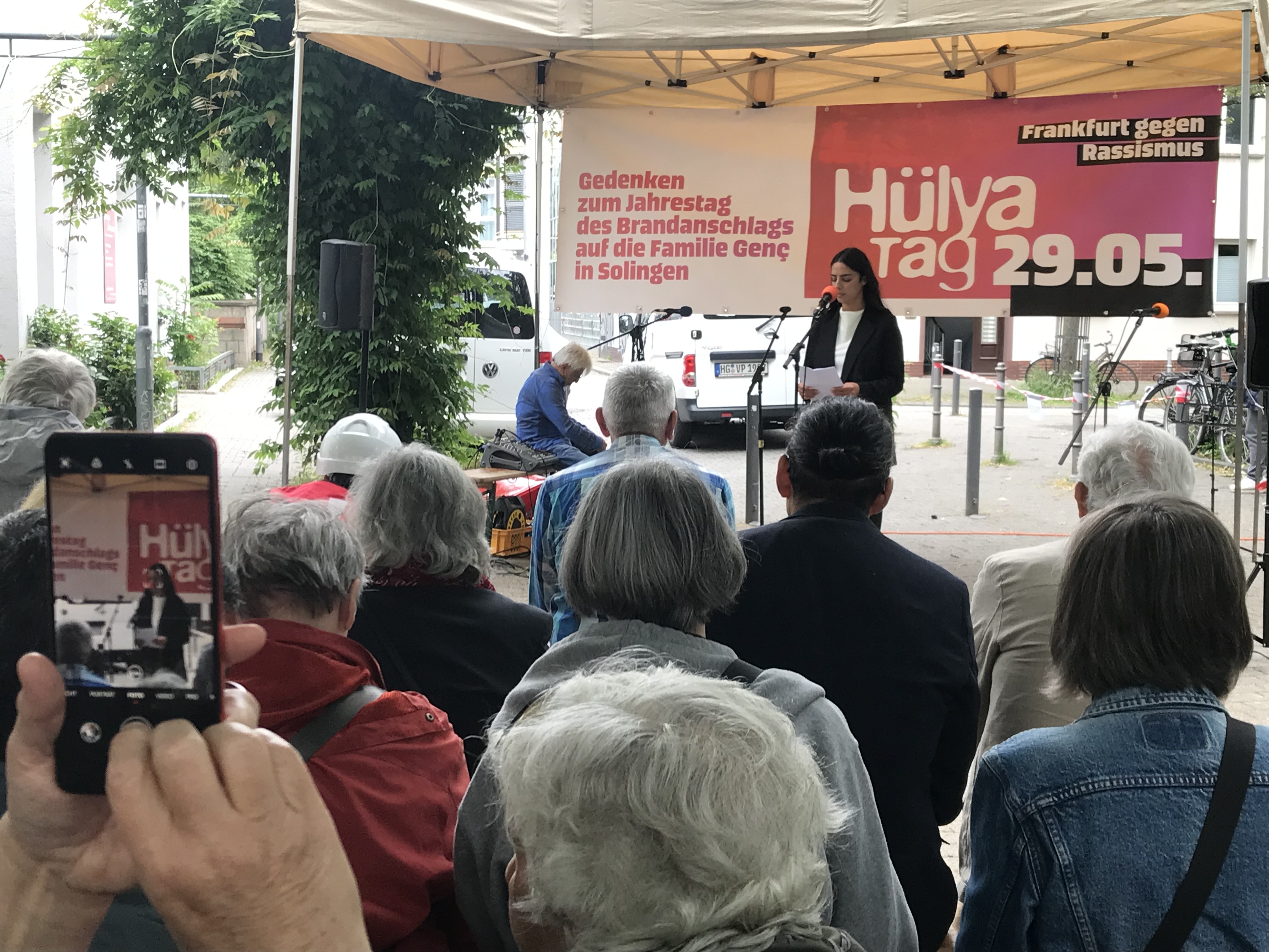 Am 29. Mai 1993 wurde in Solingen die aus der Türkei stammende Familie Genç Opfer eines Brandanschlages von vier jungen Deutschen, die größtenteils zur rechten Skinhead-Szene gehörten. Zwei Frauen und drei Mädchen, darunter die 9-jährige Hülya, starben. Vierzehn weitere Familienmitglieder erlitten zum Teil lebensgefährliche Verletzungen. Der Solinger Anschlag war 1993 der Höhepunkt einer Welle rassistischer Anschläge auf Migrant*innen in Deutschland. Im Jahr 1998 wurde in Bockenheim mit dem Hülya-Platz zum ersten Mal ein Platz nach einem Opfer von Neonazis benannt.